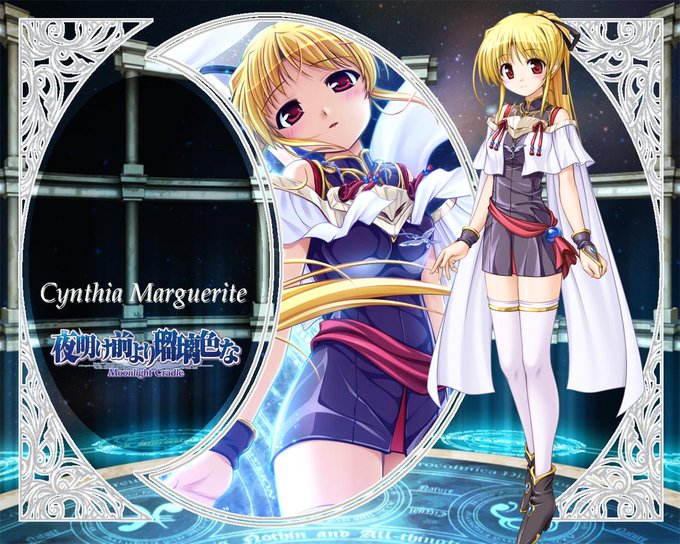 概要 『 夜明け前より瑠璃色な Moonlight Cradle 』にて登場する新キャラクター。 フィアッカ・マルグリット(オリジナル)は2つ年上の姉。 フィアッカは「シア」と呼んでいる。 本人曰く、肌年齢はともかく年齢は達哉と同じくらい。 一見、大人びてはいるが、時には少女らしい一面も覗かせる。 静寂の月光の司祭服に似たデザインの服を着ているが、これは彼女今冬発売予定のPCソフト「夜明け前より瑠璃色な Moonlight Cradle」に登場する新キャラクター、シンシア・マルグリットのコミュニティです。 まだまだ謎だらけのヒロインですが、既にその魅力に負けたと言う人向けです。 シンシア・マルグリット 誕生日:6月12日生まれ(双子座) 血液型:O型 身長:1561 85D・55・ 関連コミュニティ ARIA(アリア)シアはじめまして~シンシア・マルグリットです えりりん司祭服みたいね 陽菜ちゃん:よあけなのエステルさんに似ているのかな? シア:月の民の衣装ということで~でしょうか? 陽菜ちゃんせっかくだから集合写真でも・・・